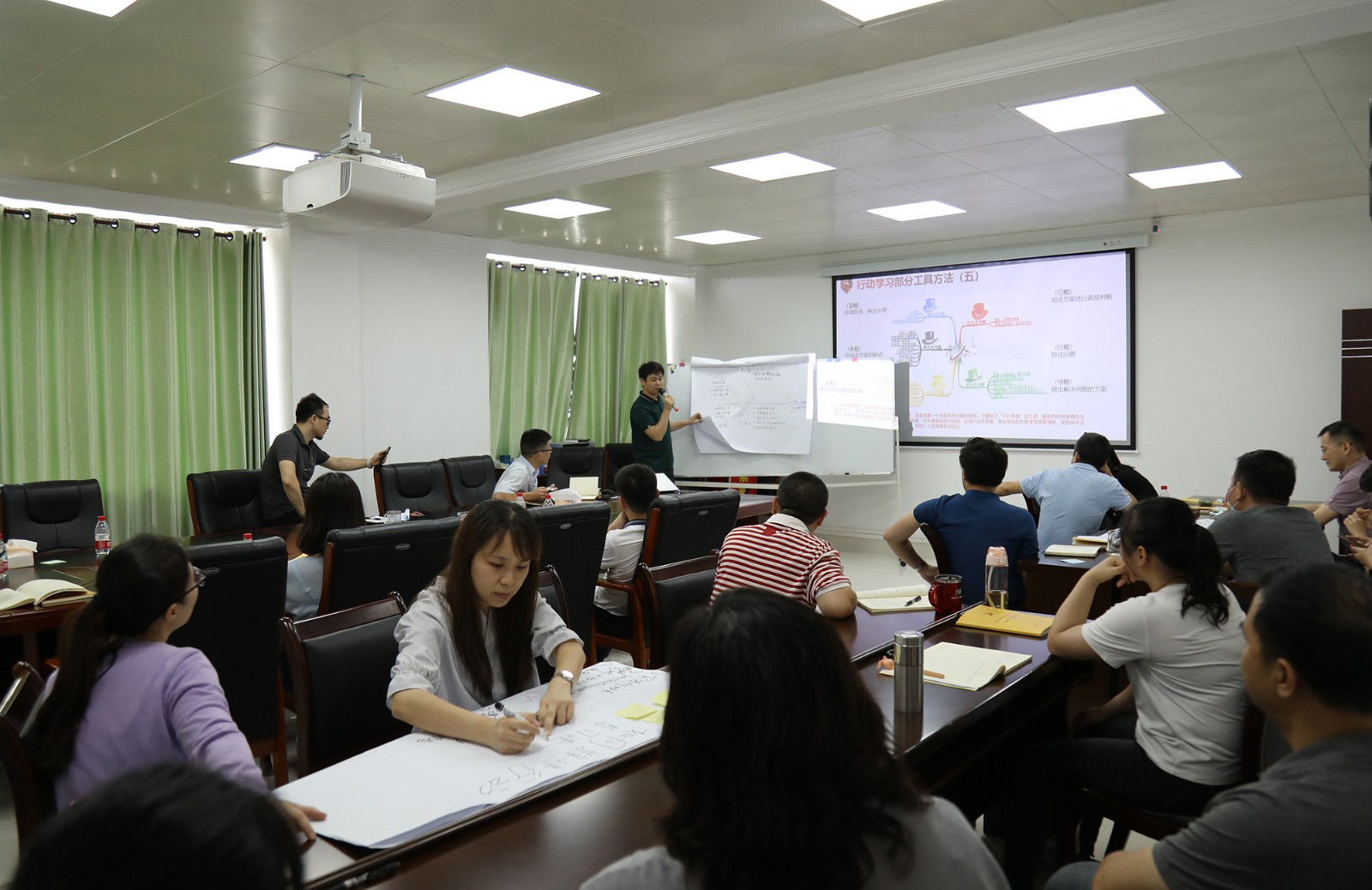 隨后各小組派代表依次上臺(tái)分享小組研討成果,其他小組則分別運(yùn)用“黃帽子”(好的)和“黑帽子”(不足)對(duì)其他小組展示成果進(jìn)行點(diǎn)評(píng)。在實(shí)操演練過(guò)程中,各小組成員積極參與踴躍發(fā)言,會(huì)場(chǎng)研討學(xué)習(xí)氛圍濃厚,大家在學(xué)習(xí)、討論、交流的過(guò)程中增長(zhǎng)了用行動(dòng)學(xué)習(xí)方法、工具解決實(shí)際問(wèn)題的能力。