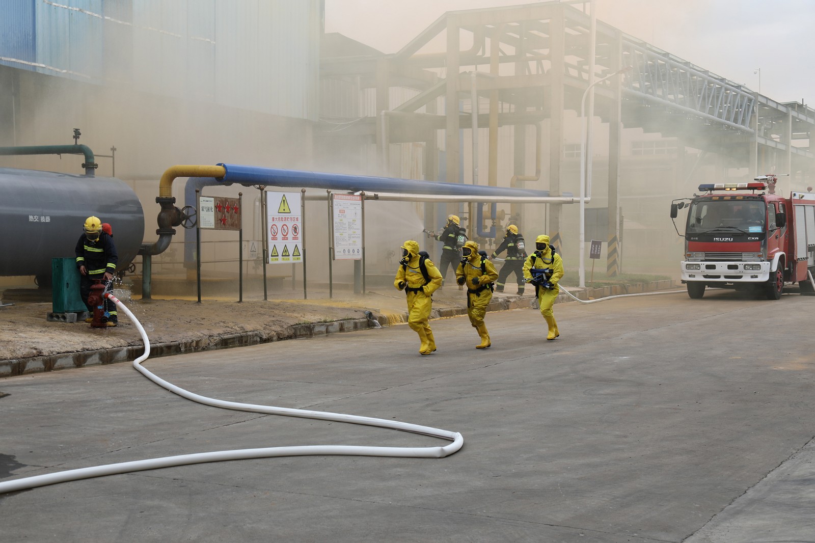 “報(bào)告班長(zhǎng),液氯充裝屏蔽泵區(qū)域有大量氯氣泄漏,情況不明?!薄皥?bào)告梁廠長(zhǎng),液氯充裝屏蔽泵區(qū)域附近有大量氯氣泄漏,情況不明?!薄笆盏?,立即啟動(dòng)氯氣泄漏事故應(yīng)急預(yù)案?!薄?月18日上午,市產(chǎn)業(yè)集團(tuán)公司2020年危險(xiǎn)化學(xué)品事故應(yīng)急救援演練活動(dòng)在市產(chǎn)業(yè)集團(tuán)廣西柳化氯堿有限公司生產(chǎn)區(qū)內(nèi)舉行,集團(tuán)公司黨委副書(shū)記、總經(jīng)理黃哲毅,副總經(jīng)理覃立基出席并指揮演練活動(dòng),集團(tuán)公司資產(chǎn)管理部工作人員及集團(tuán)公司所屬企業(yè)代表參加演練活動(dòng)。